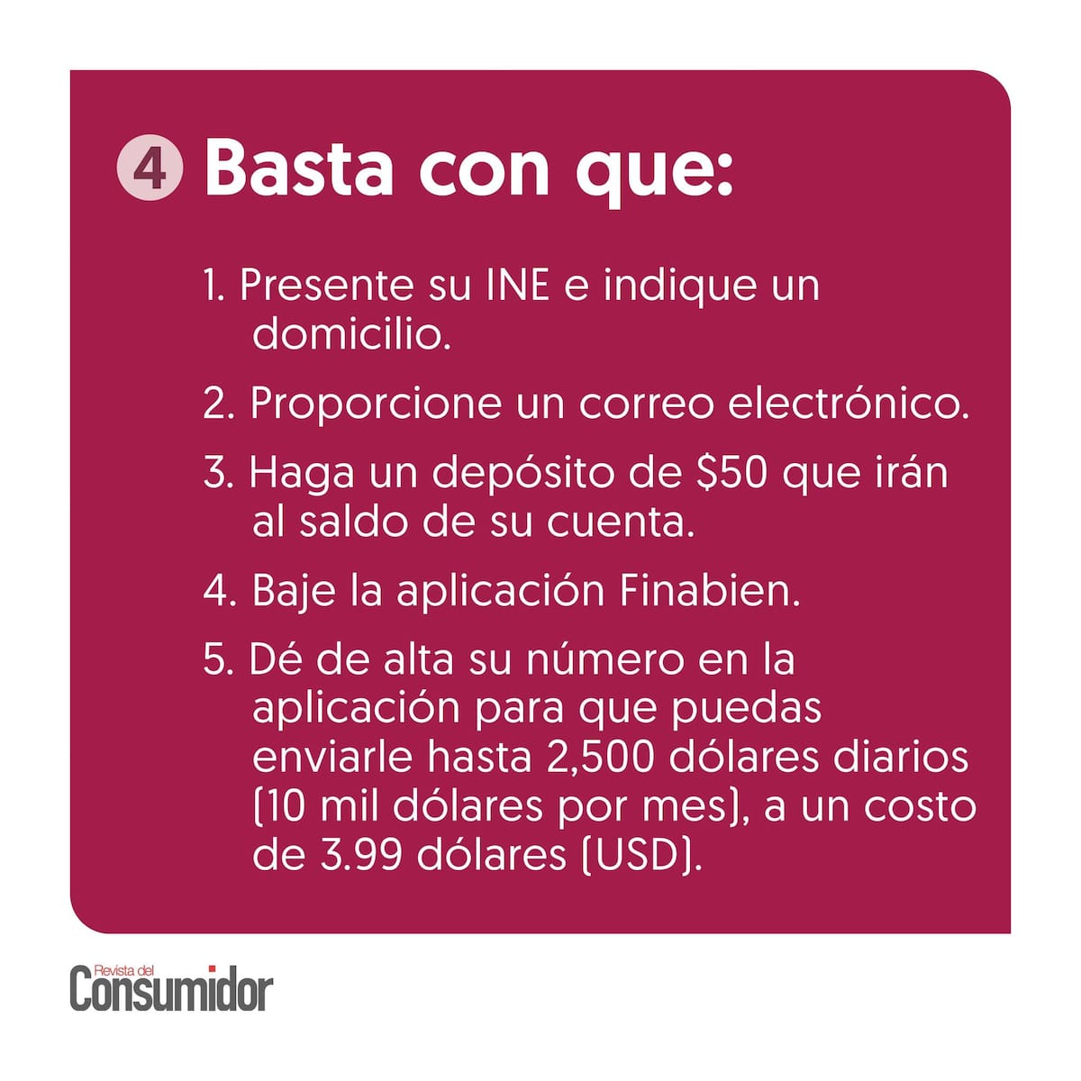 Para los usuarios más digitales, Finabien cuenta con una aplicación móvil que facilita el envío de dinero. A través de la app, los usuarios pueden transferir hasta 2,500 dólares diarios o un máximo de 10,000 dólares mensuales a un costo competitivo de 3.99 dólares por transacción. La aplicación permite enviar dinero directamente a una tarjeta Finabien México, la cual se puede activar en cualquier sucursal con requisitos mínimos: identificación oficial (INE), correo electrónico y un depósito inicial de $50 pesos.