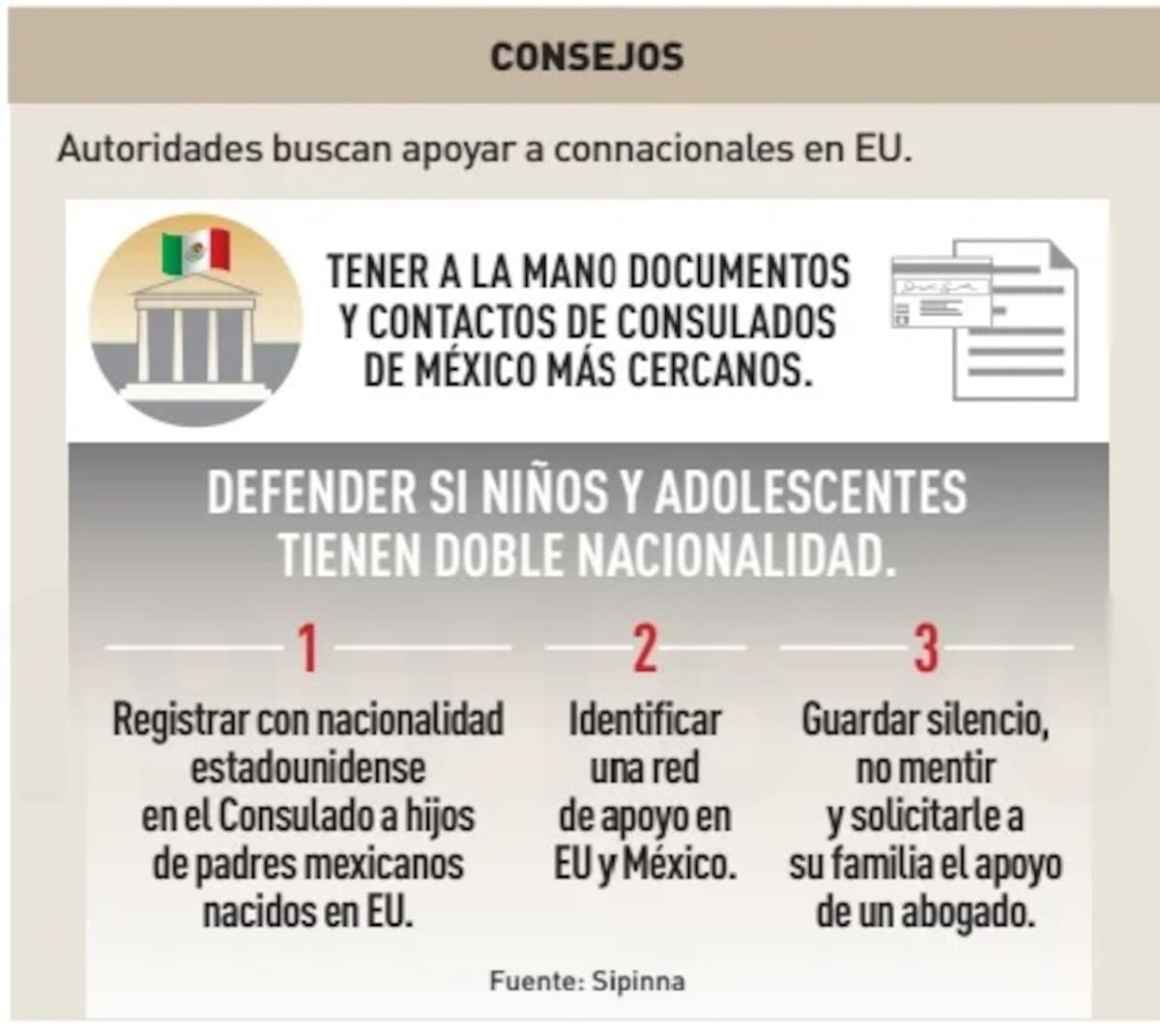 Tener a la mano documentos y contactos de consulados de México más cercanos, así como defender si niños y adolescentes tienen doble nacionalidad, son algunos consejos que da el Gobierno federal a connacionales radicados en Estados Unidos, ante la eventualidad de ser deportados.