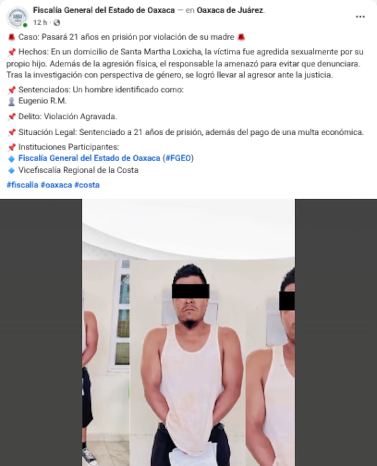 Un hombre identificado como Eugenio R.M. fue sentenciado a 21 años de prisión en Oaxaca por violar y amenazar a su madre; además deberá pagar una multa económica como reparación del daño.