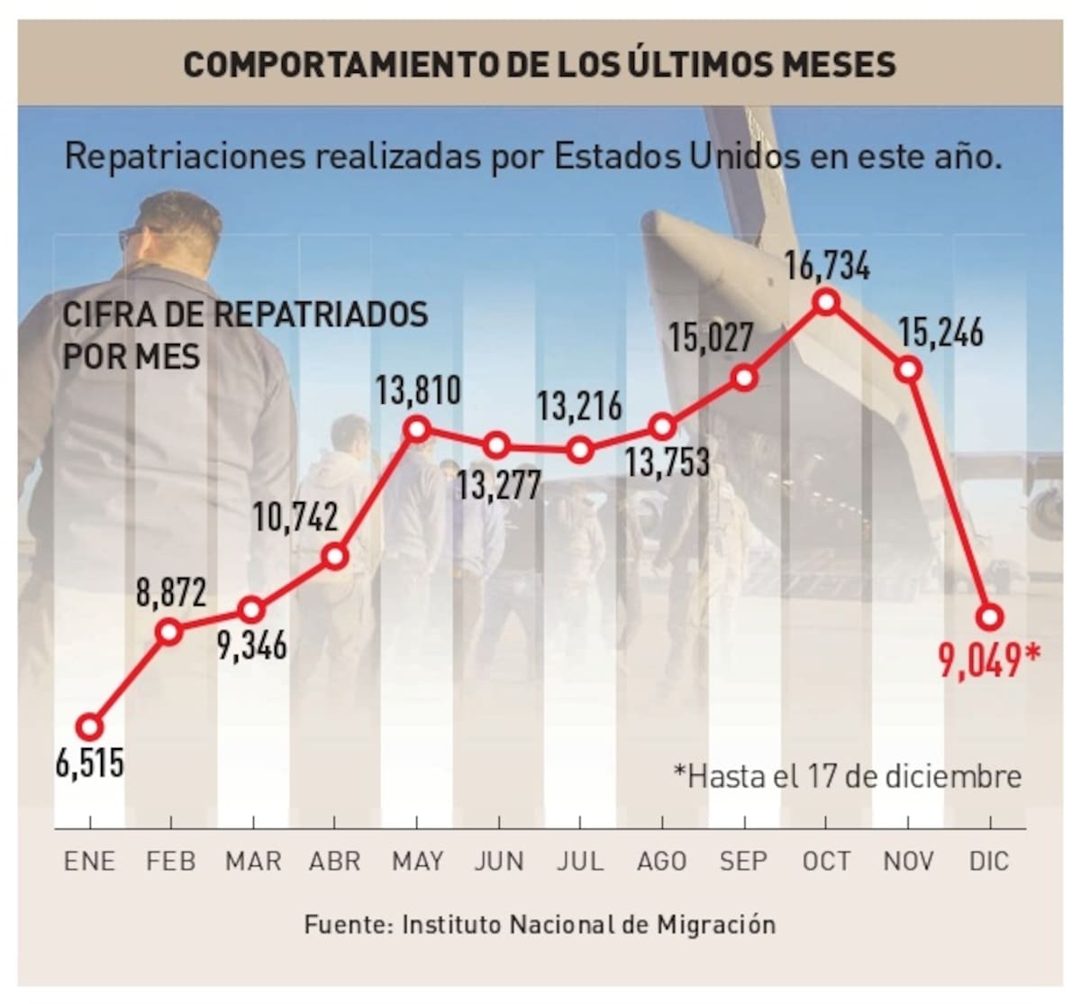 La funcionaria detalló que del 20 de enero al 17 de diciembre se registraron 145 mil 537 repatriaciones, de las cuales 116 mil 156 se realizaron por vía terrestre y 29 mil 381 por vía aérea, principalmente a los aeropuertos de Villahermosa, Tapachula y al Aeropuerto Internacional Felipe Ángeles.