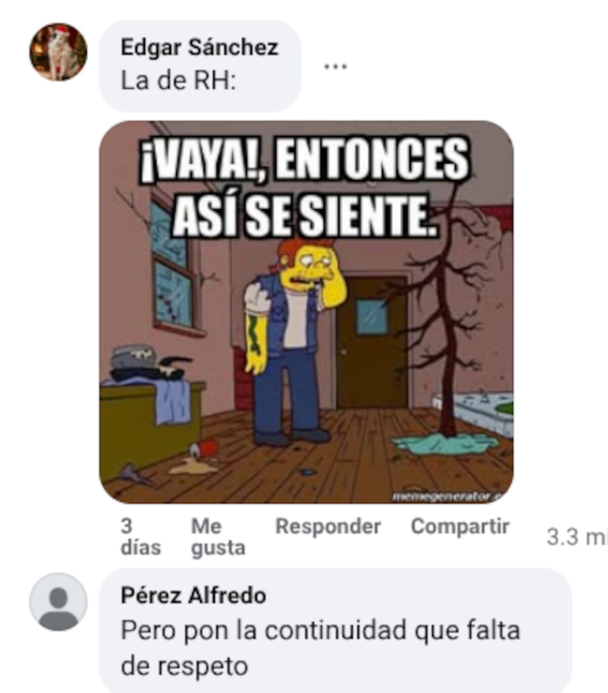 Soy RH, estoy trabajando la nómina con mi jefe y me envió un mensaje pidiéndome que le solicitara a la contadora la baja de unos colaboradores para la dispersión. Yo aparezco en la lista de bajas jajajajaja", escribió Lizet en el grupo de Facebook.