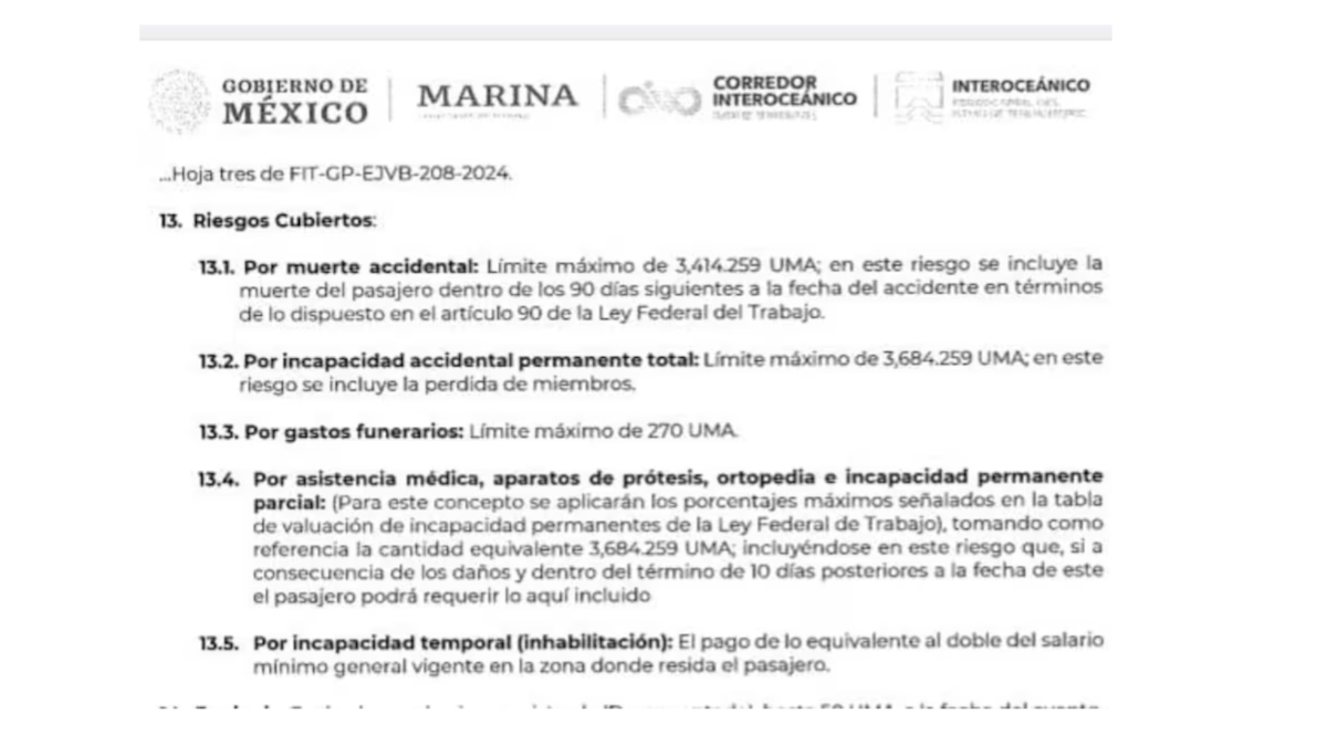 El contrato, con número FIT-GARMOP-ADQ-5-25, indica que el Ferrocarril del Istmo de Tehuantepec (FIT), operado por la Secretaría de Marina cuenta con un seguro que tuvo un costo cercano a los 10 millones de pesos y Su objetivo es brindar apoyo financiero en caso de accidentes durante el trayecto.