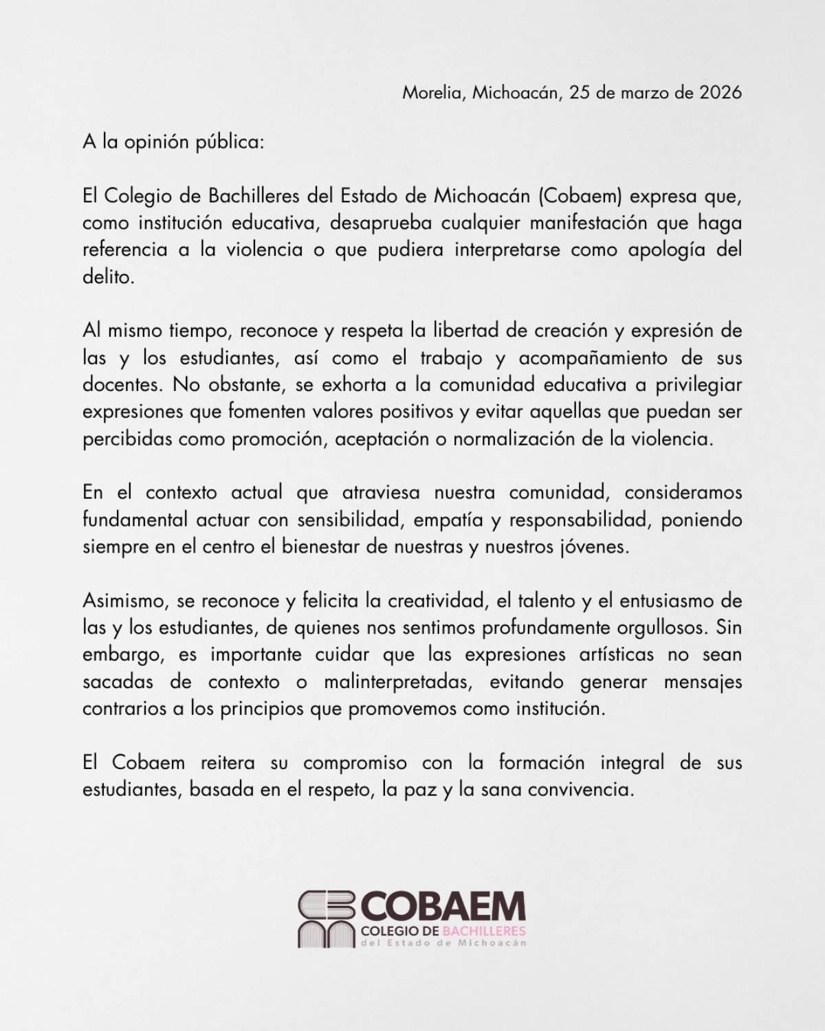 El Colegio de Bachilleres de Michoacán emitió un comunicado oficial tras la difusión del video.