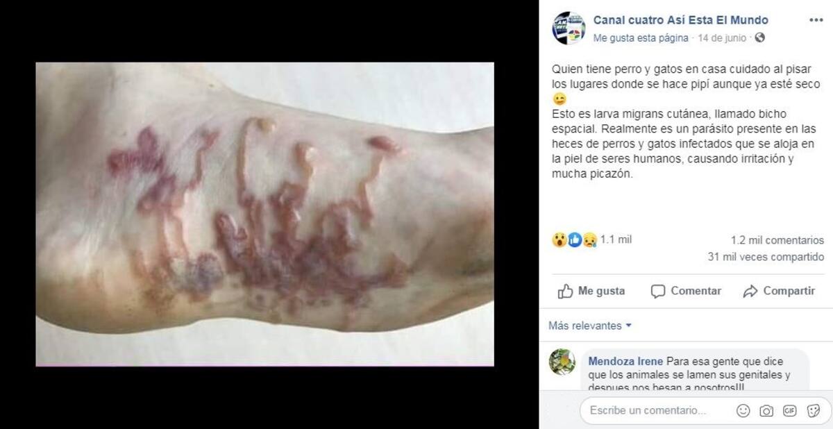 De acuerdo al medio, la persona sufrió un infección por la “larva migrans cutánea”, que se adquiere al contacto con heces de perros y gatos.