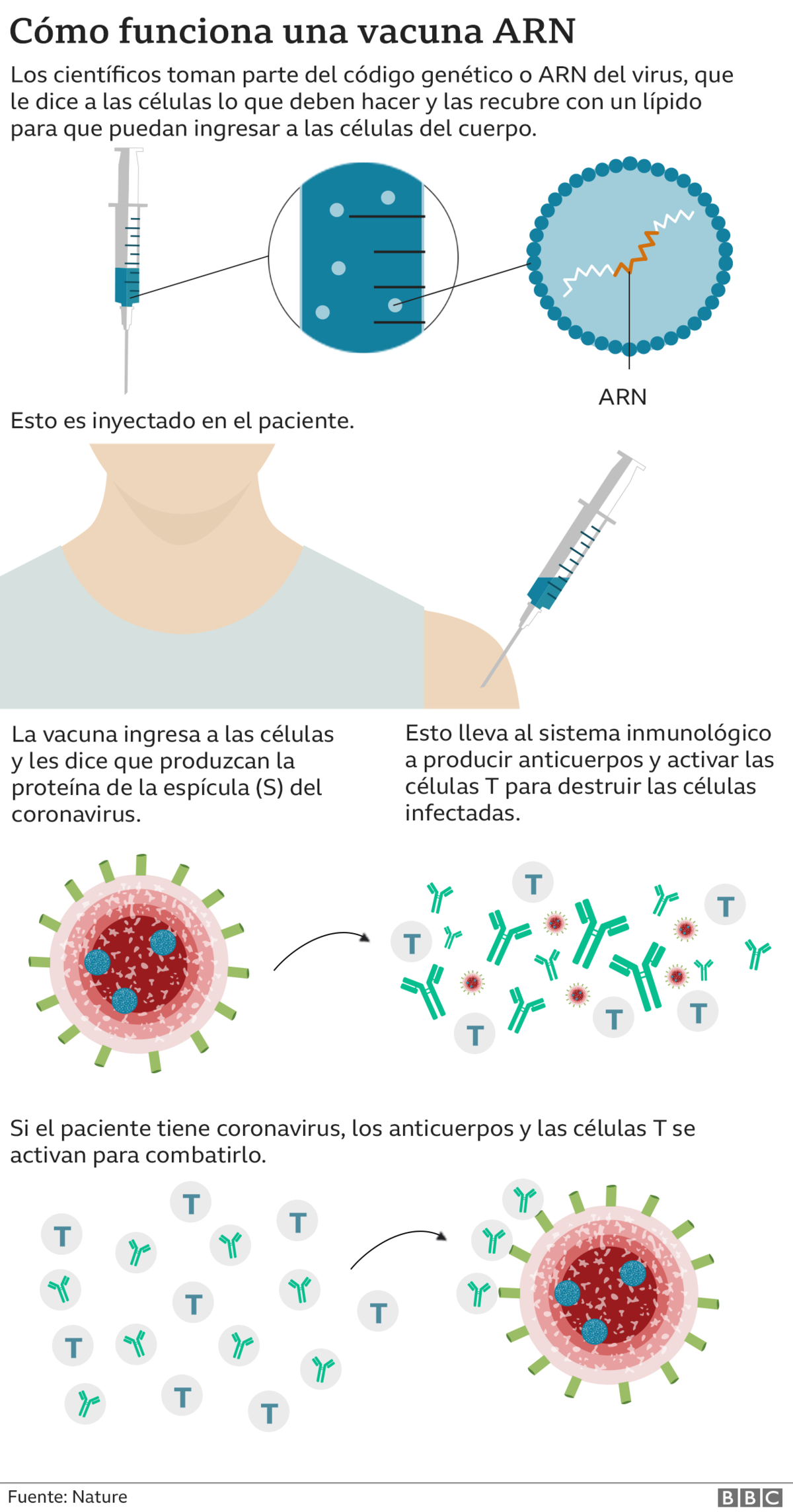 Esta utiliza la tecnología conocida como ARN: es decir, contiene una pequeña secuencia genética creada en el laboratorio que "enseña" a las propias células del cuerpo humano a producir proteínas similares a Sars-CoV-2. A partir de ahí, el sistema inmunológico reconoce la amenaza y crea una respuesta que protege al cuerpo de futuras infecciones.