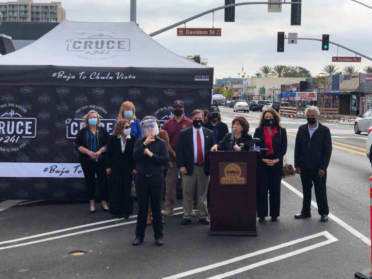 La alcaldesa de la ciudad, Mary Salas, junto a otros líderes de Chula Vista se reunieron este miércoles frente a uno de los principales restaurantes de esa zona para celebrar las mejoras al paisaje urbano.