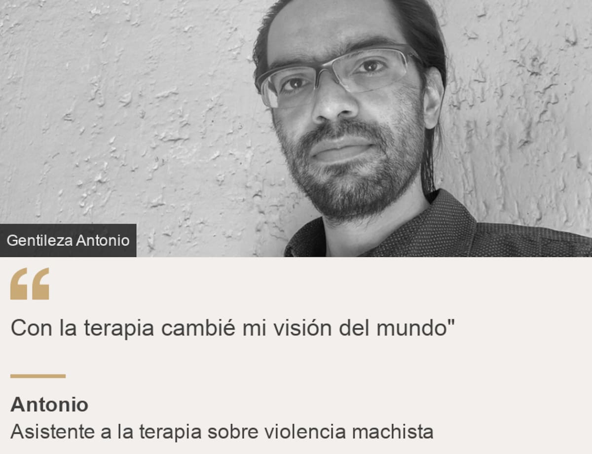 "Con la terapia cambié mi visión del mundo. La mayoría de los hombres se enfoca en decir que quienes nos agreden son ellas y no nos damos cuenta de que el 99% de la violencia que sufrimos los hombres es a manos de otros hombres", señala Antonio en una conversación con BBC Mundo.