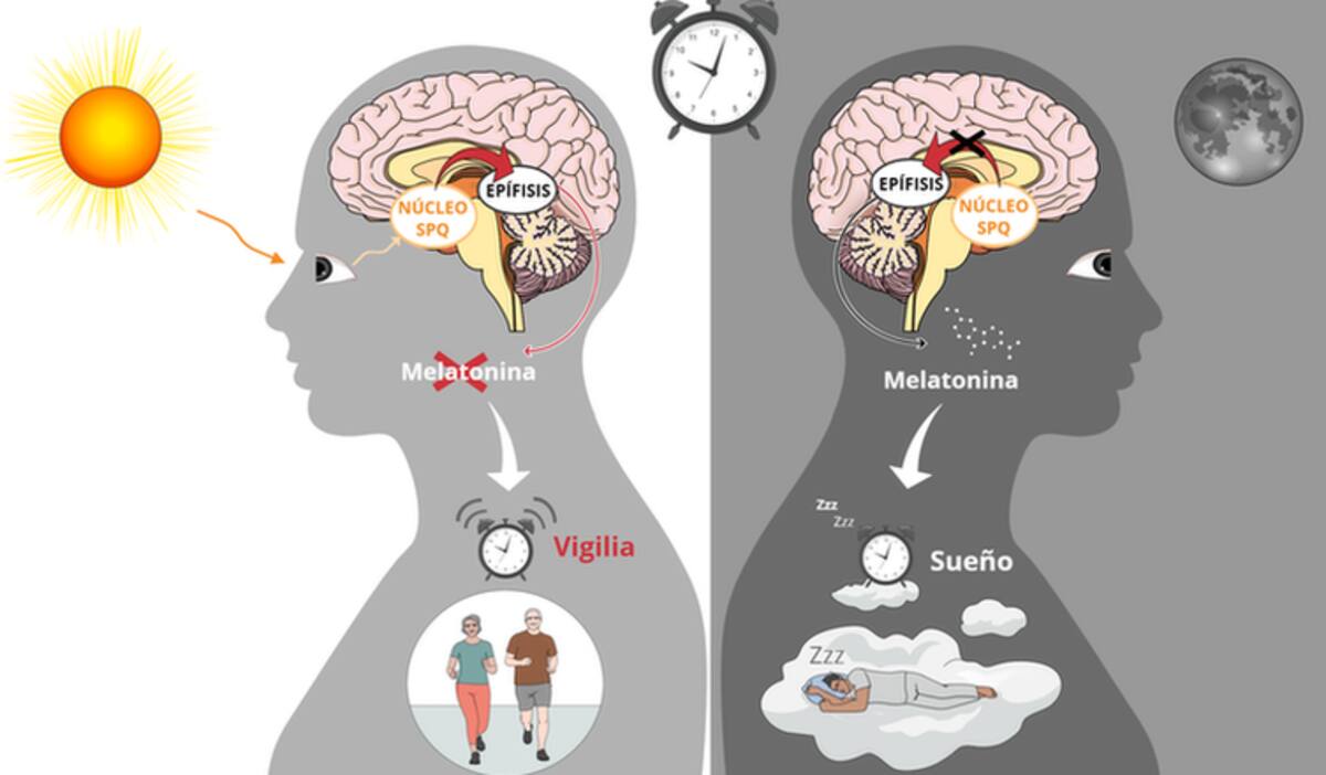 La retina registra la información lumínica, que llega al núcleo supraquiasmático (SPQ) del hipotálamo (ver esquema).