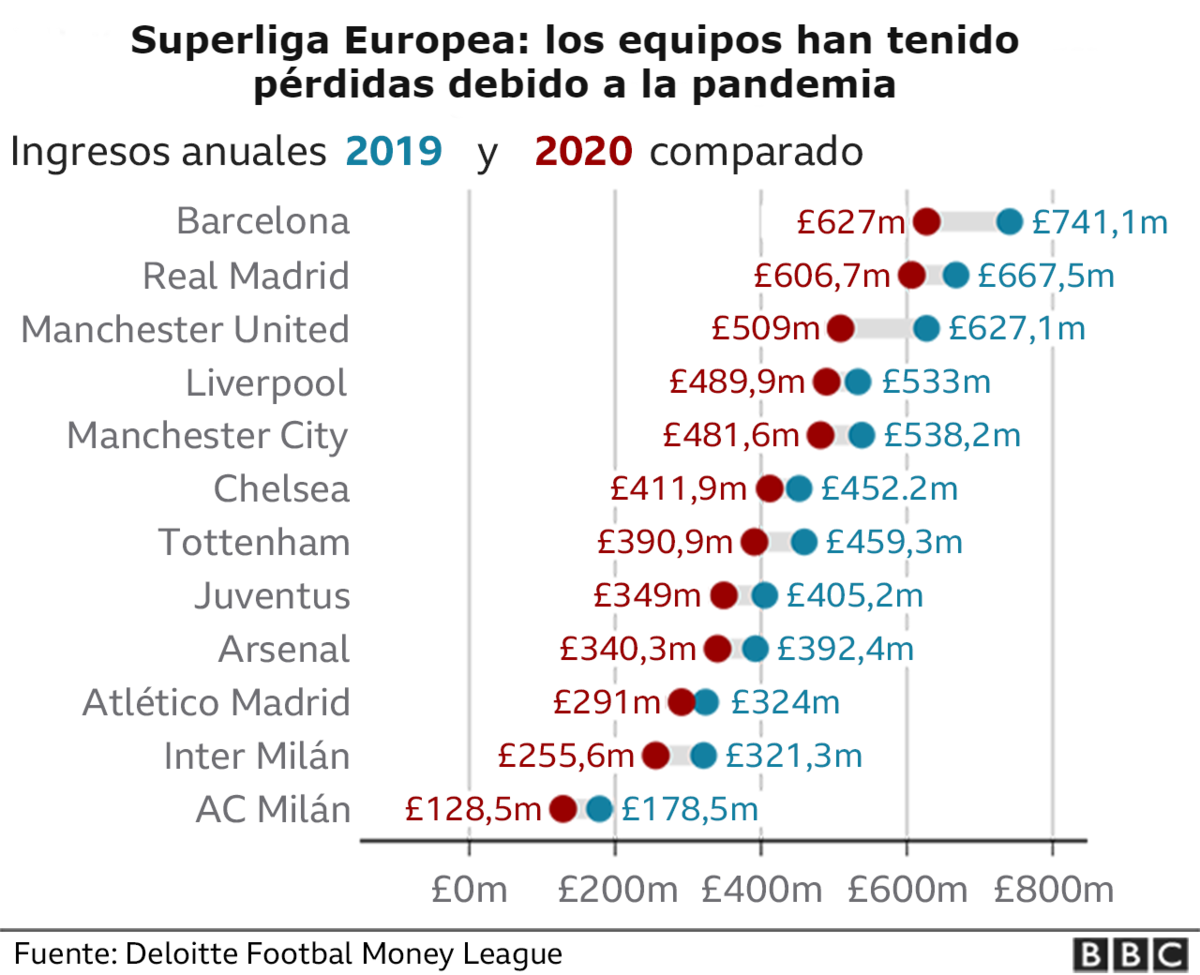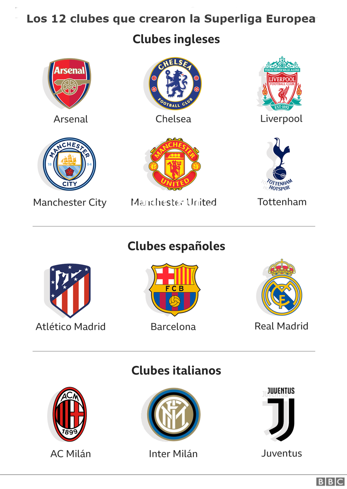 De acuerdo a la propuesta de la polémica "Superliga Europea" (ESL, por sus siglas en inglés), los miembros fundadores -Arsenal, Chelsea, Liverpool, Manchester City, Tottenham Hotspur, Atlético de Madrid, Real Madrid, Barcelona, AC Milán, Inter de Milán y Juventus- tendrán un cupo permanente en el torneo, que comenzaría en agosto de 2022.