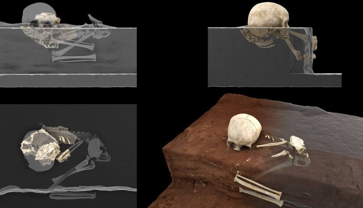 En un artículo publicado en la revista especializada Nature, los investigadores que estudiaron los frágiles y antiguos restos describieron cómo la cabeza del menor parecía haber sido colocada sobre una almohada.