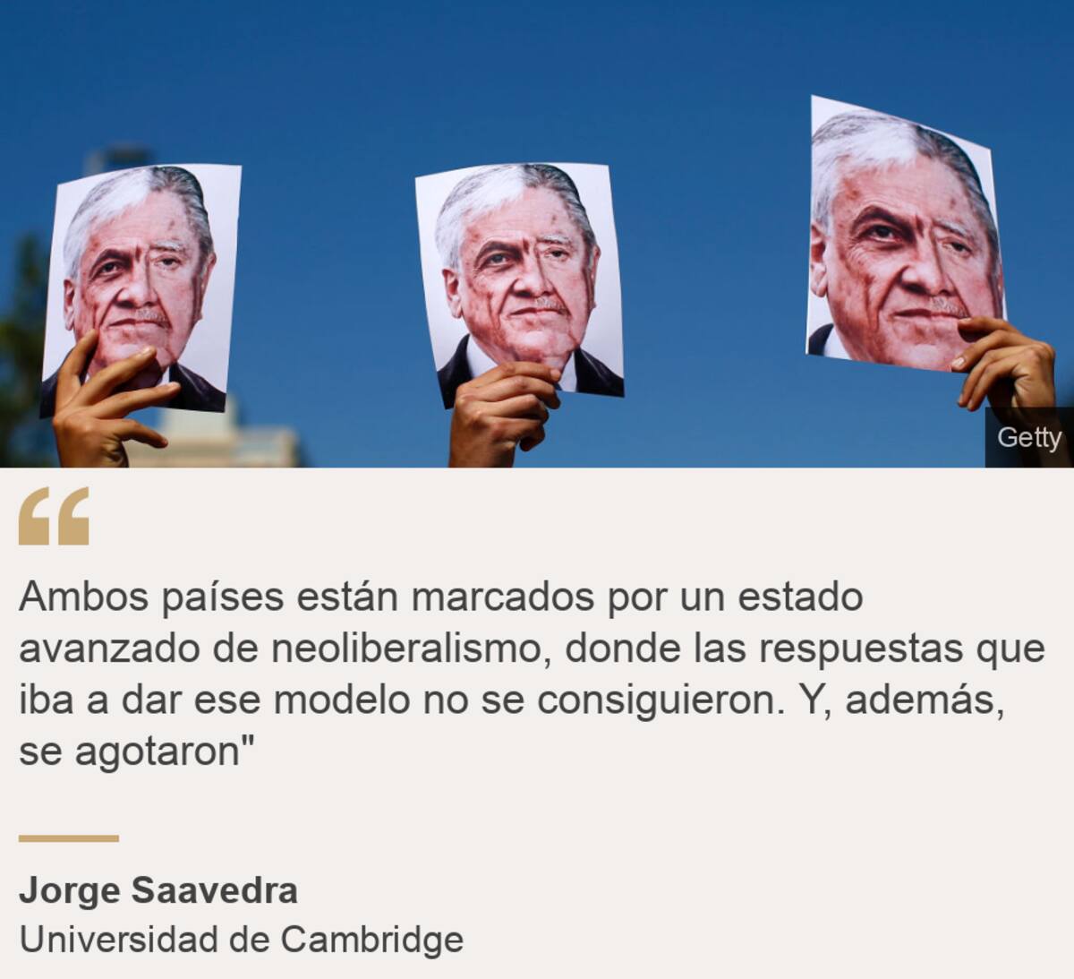 "Ambos países están marcados por un estado avanzado de neoliberalismo, donde las respuestas que iba a dar ese modelo no se consiguieron. Y, además, se agotaron", le dice a BBC Mundo Jorge Saavedra, académico de la Universidad de Cambridge y experto en temas de América Latina.