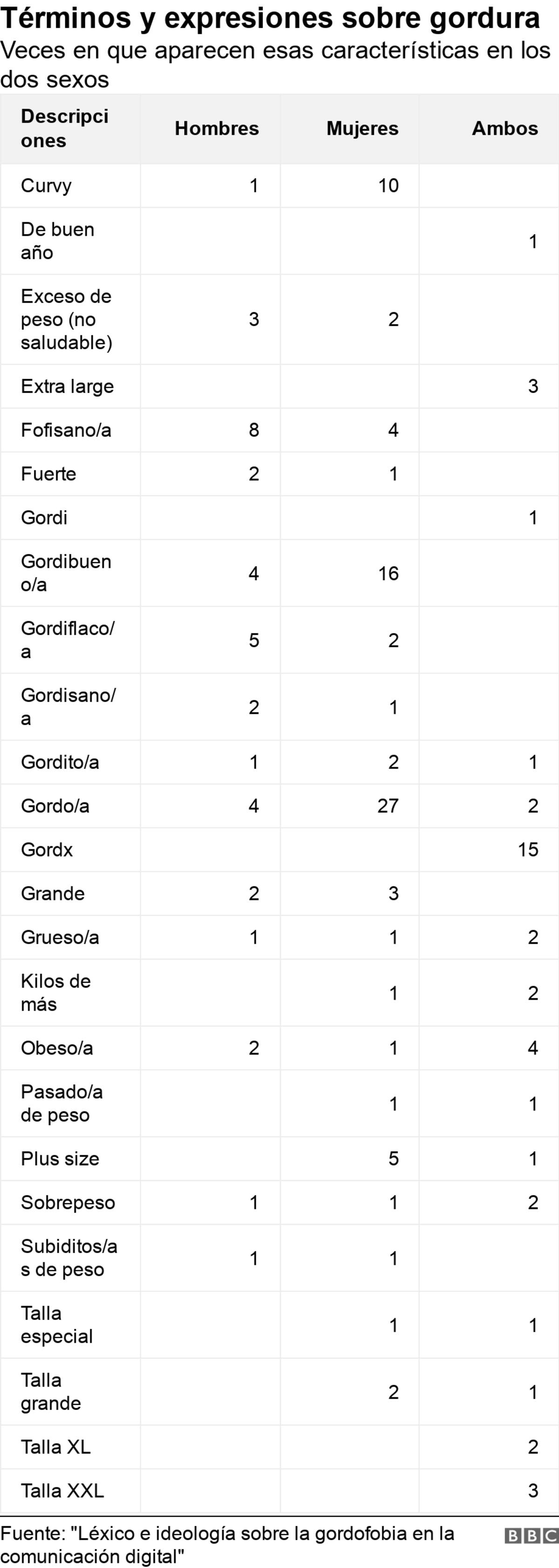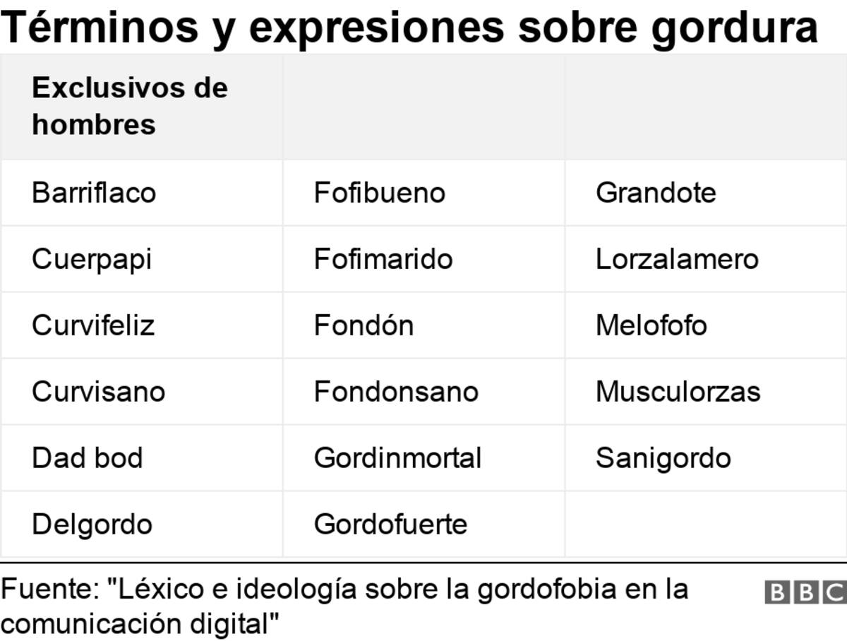 El estudio analizó 100 textos en español relacionados a la gordura en los que se encontraron 85 formas distintas de referirse a esa característica con términos como "curvas generosas", "de huesos grandes", "entrada en carnes", para las mujeres y "cuerpapi", "musculorzas" y "gordofuerte", para hombres.