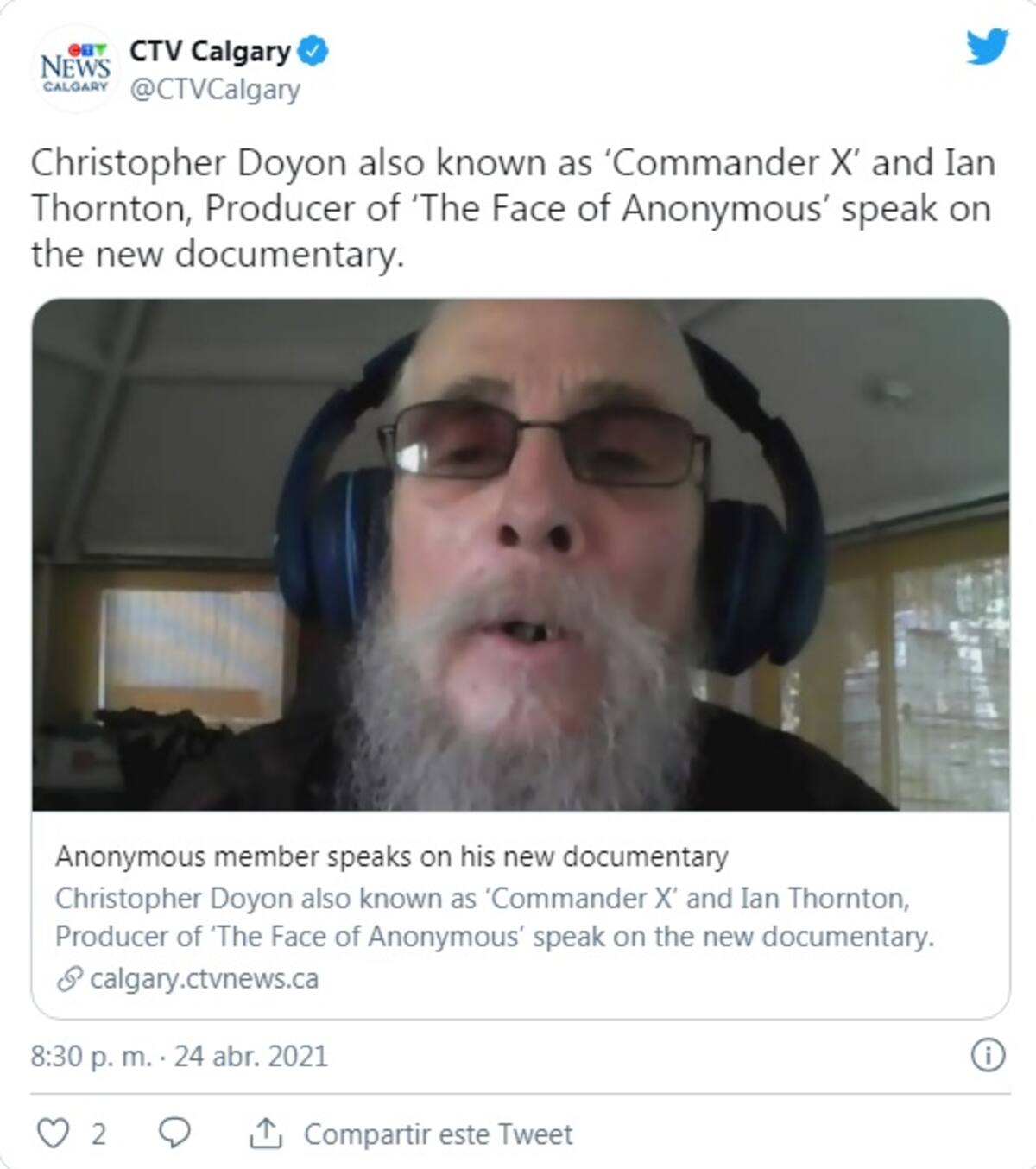 Doyon decidió contar su historia en un documental producido por el canal de televisión pública canadiense TVO, titulado ‘El rostro de Anonymous’, pese a que era un prófugo de la justicia.