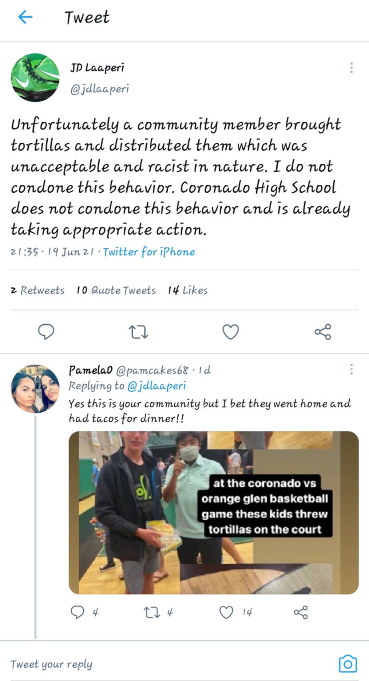 El entrenador de Coronado JD Laaperi se disculpó públicamente vía Twitter por el incidente, "desafortunadamente un miembro de la comunidad trajo las tortillas y las repartió lo cual es un acto inaceptable y de naturaleza racista. Yo no apruebo este comportamiento. La preparatoria de Coronado no aprueba este comportamiento y está tomando las acciones apropiadas".