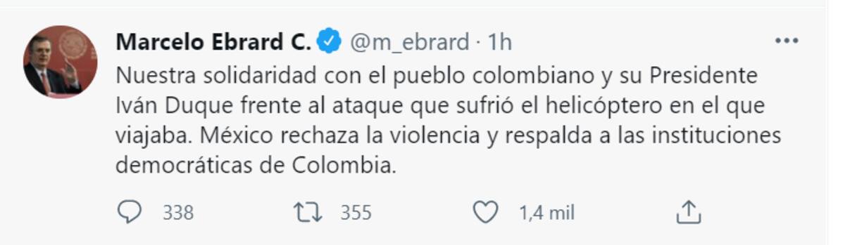 "Nuestra solidaridad con el pueblo colombiano y su Presidente Iván Duque frente al ataque que sufrió el helicóptero en el que viajaba. México rechaza la violencia y respalda a las instituciones democráticas de Colombia", dijo el canciller.