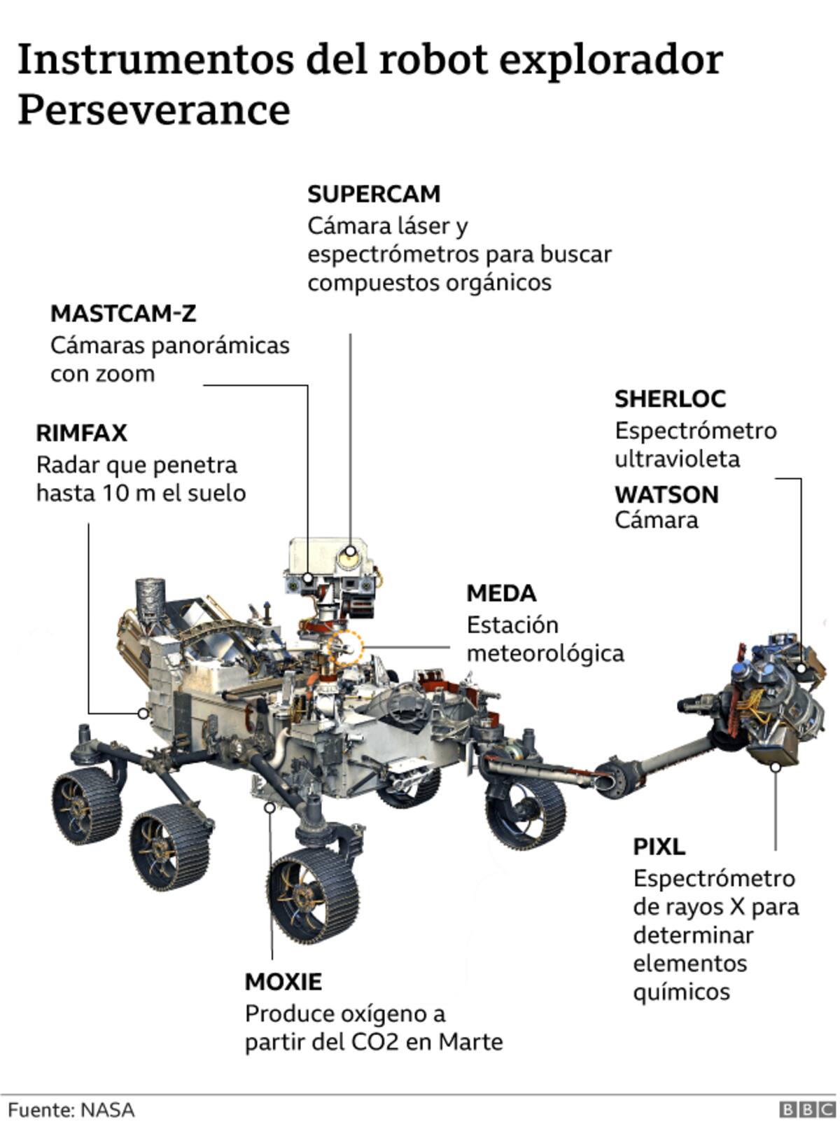 Perseverance aterrizó en Marte en febrero, en un cráter de 45 kilómetros de ancho llamado Jezero. Su misión es averiguar si existe vida en Marte, o si alguna vez existió.