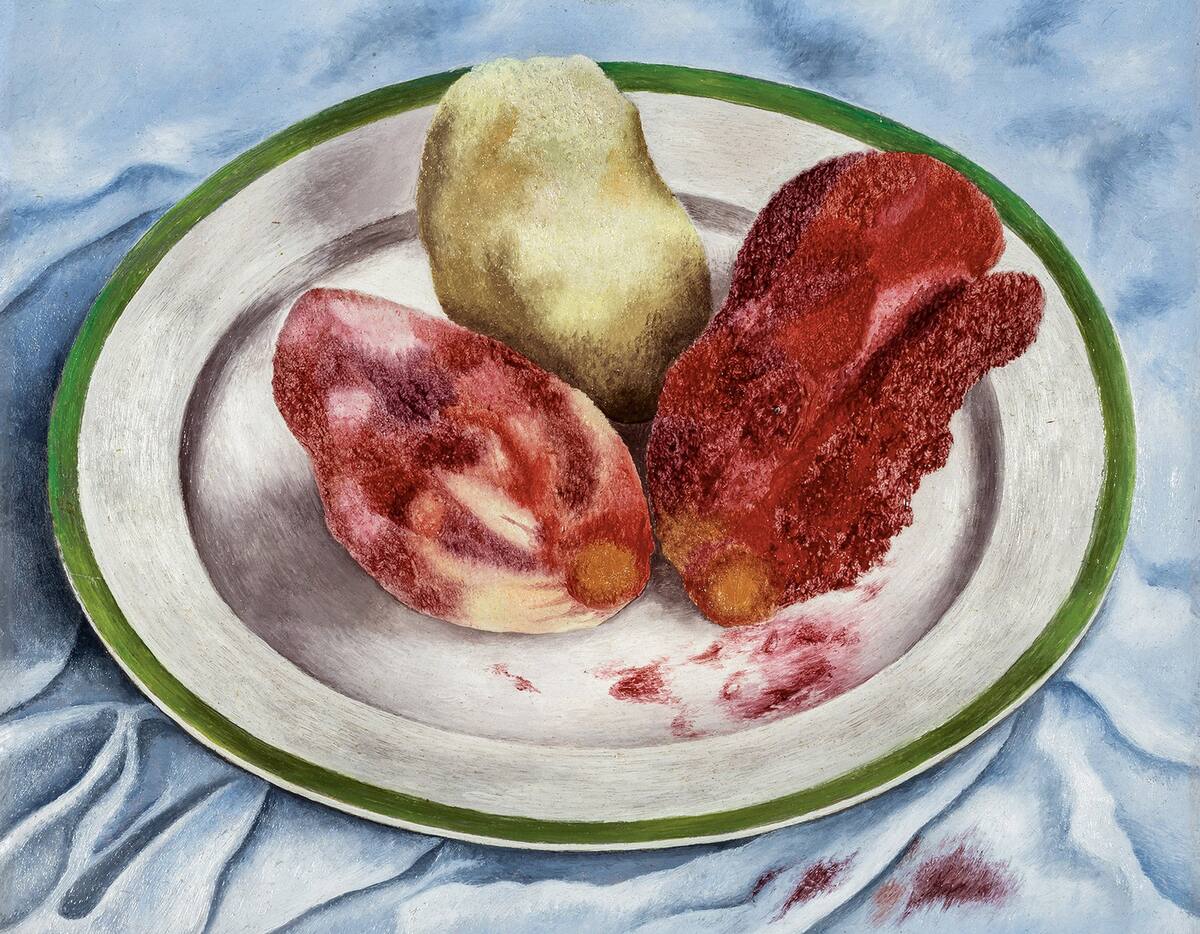 Él ofrece una nueva interpretación de una pintura de 1938, llamada "Tunas", en la que representa tres de estas frutas en diferentes estados de madurez -desde verdes y parcialmente maduras hasta vibrantes de jugo y rojo ensangrentado-, como si estuvieran ilustrando la propia noción de Kahlo sobre su maduración como artista y persona, pero también con un potencial simbolismo religioso (la carne sangrienta que evoca el sacrificio).