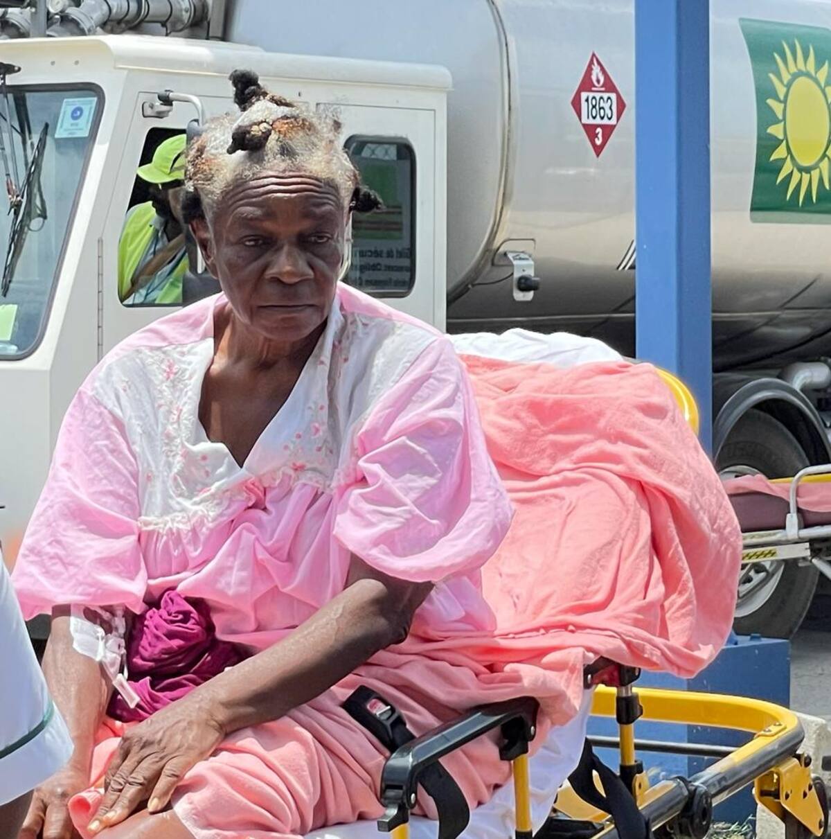 Sentada en una camilla, también mirando a la nada, está Widelene, una anciana que perdió a su hija y a sus dos nietos en el terremoto.
