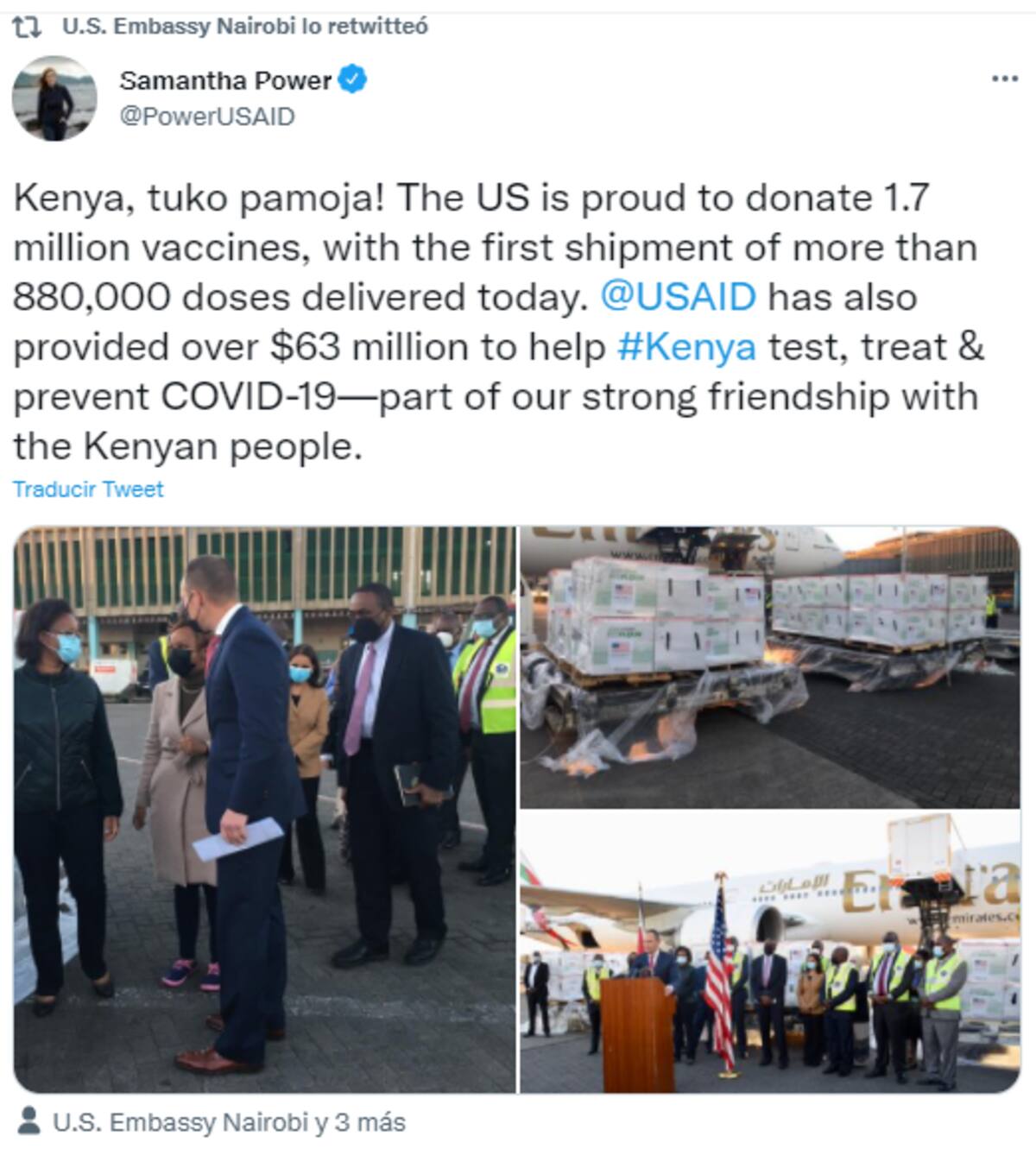 Estamos muy agradecidos con el gobierno de Estados Unidos por esta generosa donación de vacunas de Moderna (…) Esto será de gran ayuda para apoyar las campañas de vacunación y llegar a la meta de 10 millones de ciudadanos de Kenya vacunados para finales de diciembre de 2021”.