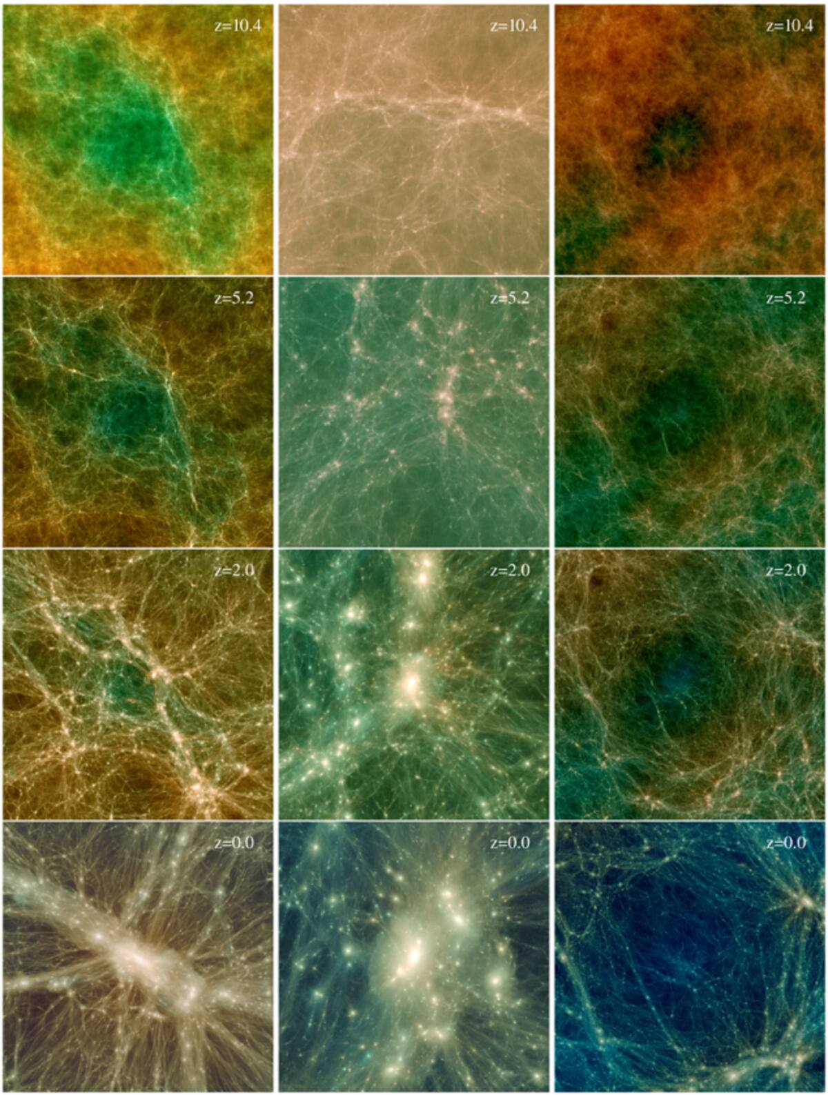 Francisco Prada: "Esta imagen muestra cuatro instantes en la historia del universo, el presente es abajo y el pasado es arriba. Y las tres columnas corresponden a regiones diferentes del universo.