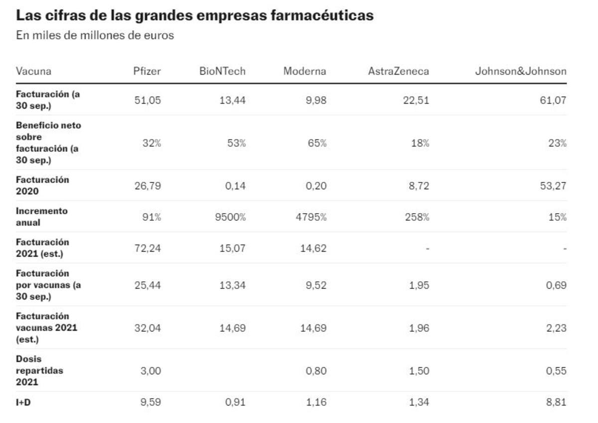 El medio español destacó que este 2021, las principales farmacéuticas como Pfizer, BioNTech, Moderna, AstraZeneca y Johnson & Johnson, prevén cerrar 2021 con 65 mil 600 millones de euros facturados por sus inyecciones contra la Covid-19, más del doble que todo el sector de las vacunas antes de la pandemia.