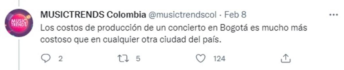 Por su parte, la MUSICTRENDS Colombia respondió que los elevados precios de los boletos se deben a que “los costos de producción de un concierto en Bogotá es mucho más costoso que en cualquier otra ciudad del país”.