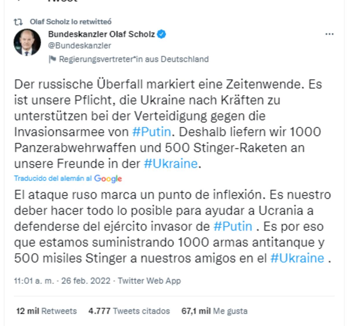 "La agresión rusa contra Ucrania marca un cambio de era. Amenaza todo nuestro orden de posguerra. En esta situación, es nuestra obligación apoyar a Ucrania en la medida de nuestras posibilidades en la defensa contra el ejército invasor de Vladímir Putin", declaro el canciller, Olaf Scholz.