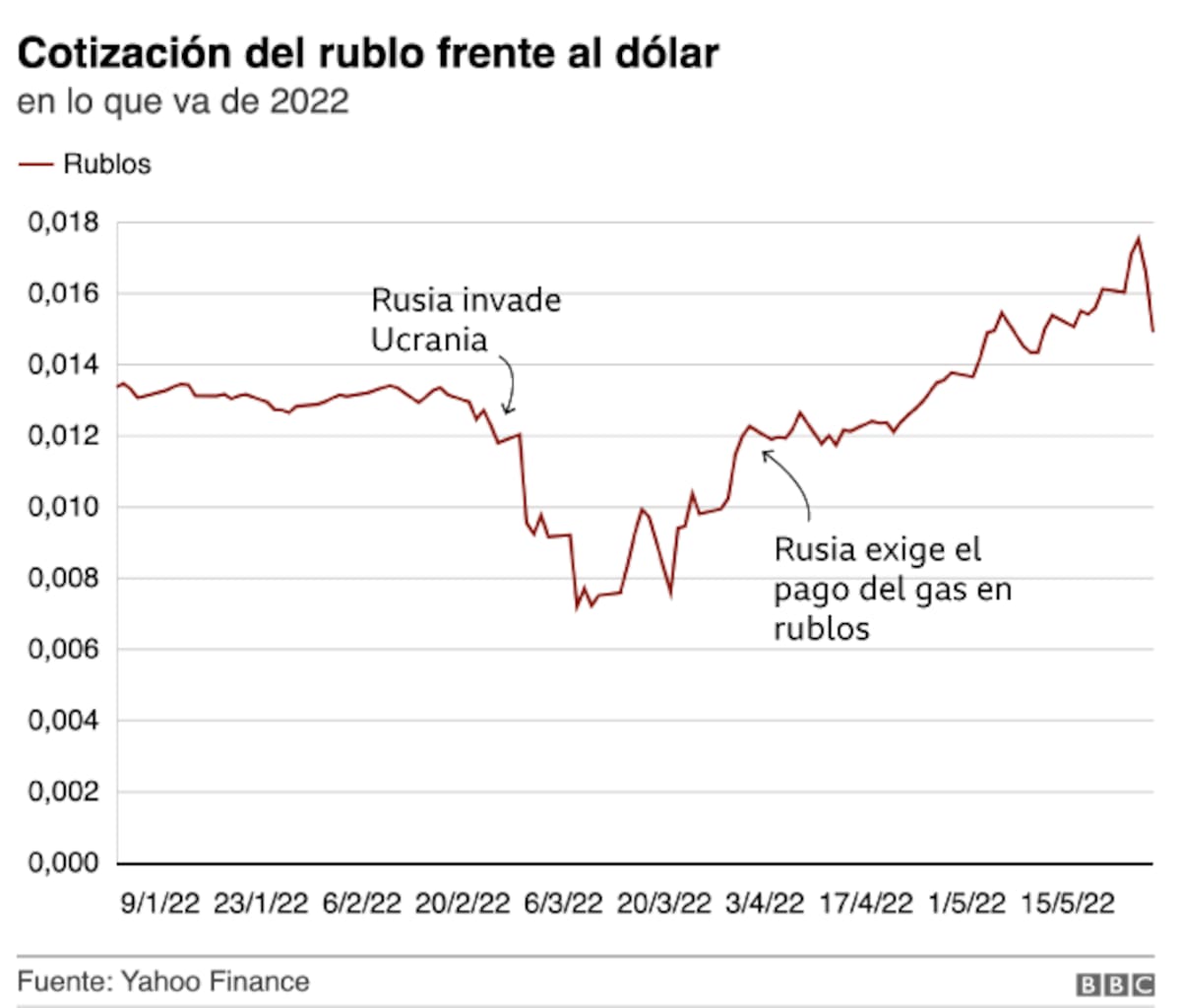 Otra de las medidas para defender su divisa fue exigir a los países de la Unión Europea que le compran gas natural que paguen sus facturas en rublos, en lugar de dólares o euros.