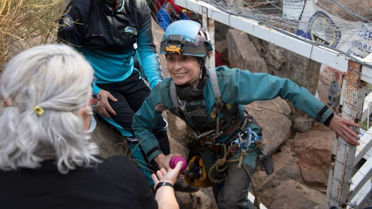 La deportista Beatriz Flamini, de 50 años, salió este viernes de una cueva en la provincia de Granada, España, donde se aisló voluntariamente por 500 días a 70 metros de profundidad.