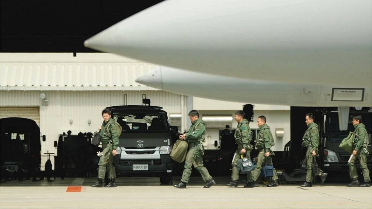 Tres aviones despegan uno tras otro para comenzar el entrenamiento del día con simulaciones de combate, intercepciones aéreas, respuestas a ataques o misiones de emergencia para cortar el paso a aeronaves chinas sospechosas.