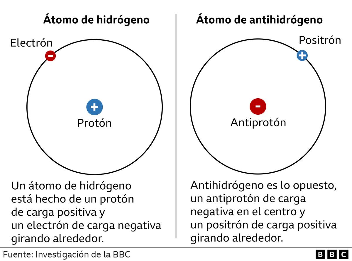 Tomemos el antihidrógeno, que es la versión de antimateria del hidrógeno, utilizada en los experimentos del CERN. Tiene un protón de carga negativa (antiprotón) en el centro con una versión positiva de electrón (positrón) girando en torno.