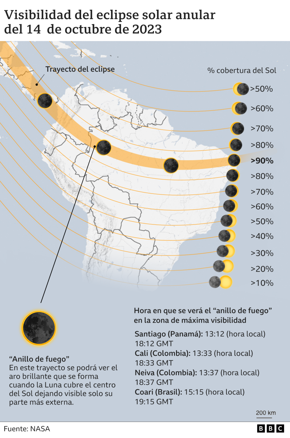 "Un eclipse anular ocurre solamente cuando la Luna está en su punto más alejado de la Tierra. En perspectiva para nosotros en la Tierra, no bloquea completamente la luz del Sol, por lo que se obtiene este increíble anillo de fuego alrededor de la Luna”, explica a la BBC Nicola Fox, de la Dirección de Misiones Científicas de la NASA.