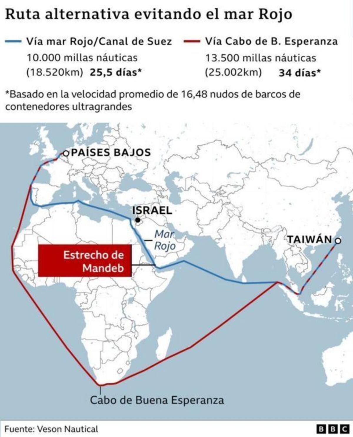 Sin embargo, en la práctica los ataques están afectando a todo tipo de buques que en la mayoría de casos no tienen vinculación alguna con Israel y se dirigen a otros países.