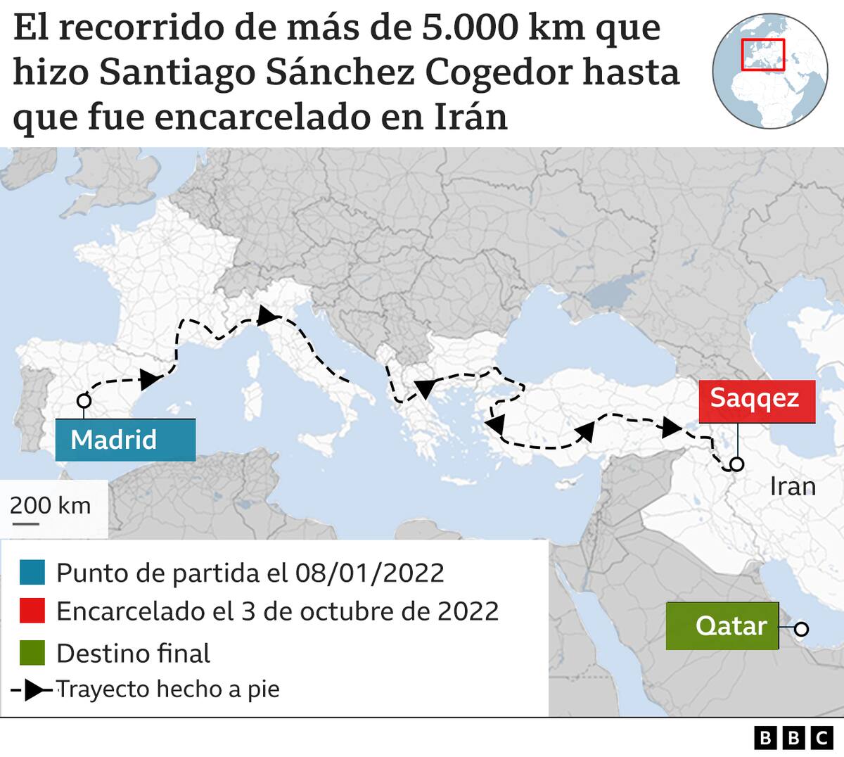 Santiago Sánchez se propuso caminar a Qatar para ver a la selección española en el mundial de fútbol, pero terminó preso en una de las prisionas más temidas de Irán. Le relató a BBC Mundo qué ocurrió.
