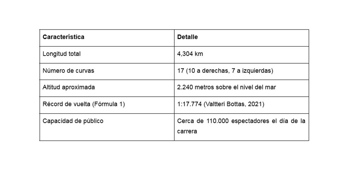 A continuación, se muestra una tabla con algunos datos básicos sobre el Autódromo Hermanos Rodríguez, esenciales para comprender por qué ofrece un desafío distinto a otras pistas: