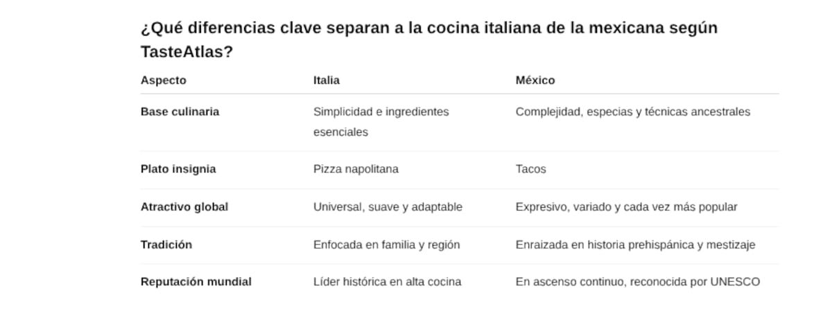 Italia recuperó el primer lugar como la mejor cocina del mundo según TasteAtlas 2025-2026. México se colocó muy cerca del Top 10 gracias a su diversidad regional y a la fama internacional de platillos como tacos, mole y barbacoa.