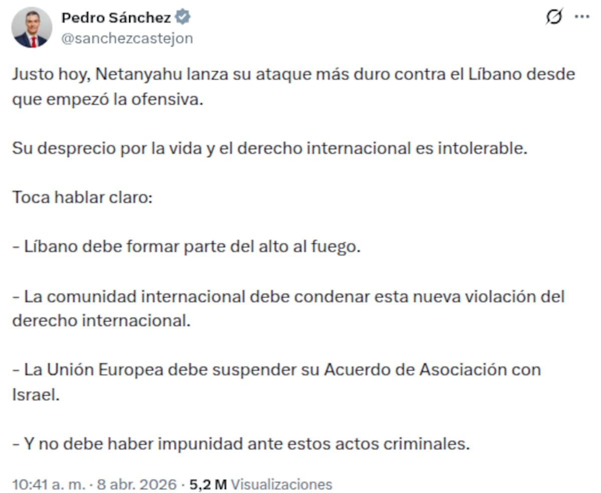 Como parte del contexto que explica el deterioro de la relación bilateral, el presidente del Gobierno de España, Pedro Sánchez, publicó el pasado 8 de abril un mensaje en su cuenta oficial de X con críticas directas hacia la actuación de Israel en la región.