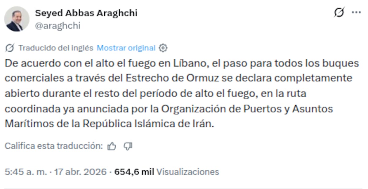 El ministro de Asuntos Exteriores iraní, Abás Araqchi, informó que el paso de todos los buques comerciales por el estrecho de Ormuz se mantiene completamente abierto durante el periodo restante del alto el fuego vinculado al conflicto en Líbano. La declaración fue difundida en su cuenta oficial en la red social X y retoma lo ya anunciado por la Organización de Puertos y Asuntos Marítimos de Irán.