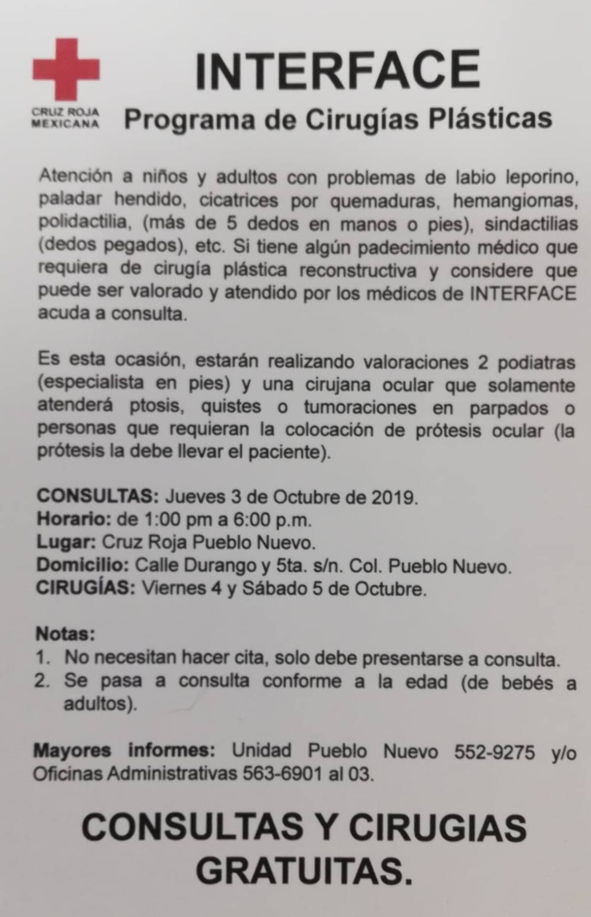 Las cirugías se realizarán el viernes 4 y sábado 5 de octubre, no se necesita hacer cita, solo debe de presentarse antes a la consulta mencionada, el orden de prioridad será de bebés a adultos.