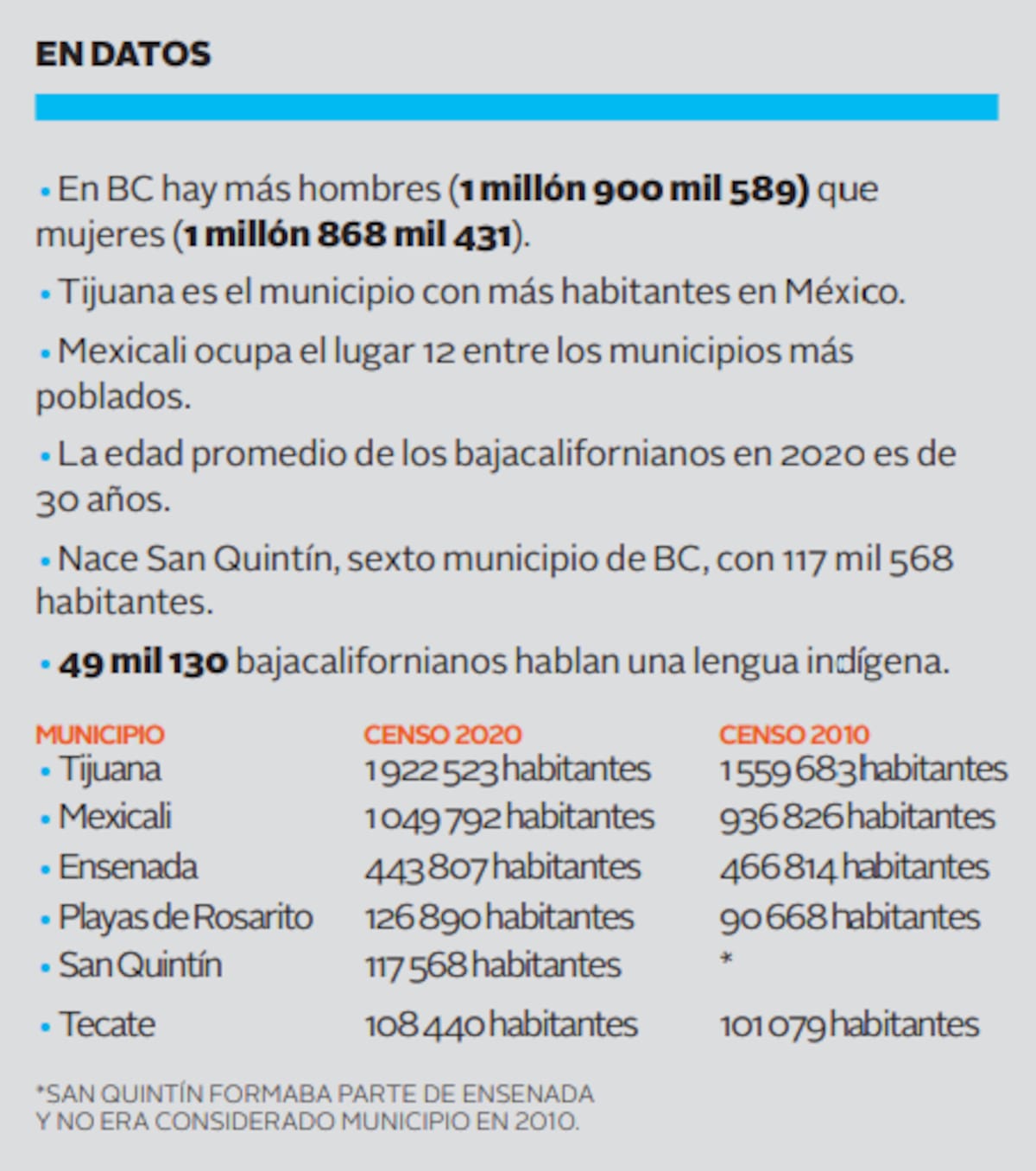 Debido a la conformación de San Quintín como el sexto municipio de Baja California en 2020, por primera ocasión el INEGI contabilizó a los habitantes de esta zona de forma independiente, resultando en el conteo de 117 mil 568 habitantes.