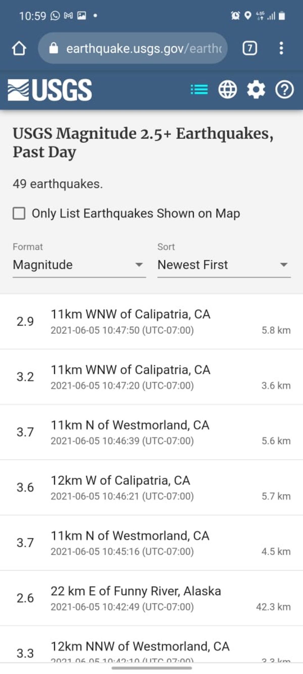 Los habitantes al sur del Mar Salton, un lago formado en 1905 cuando una crecida alcanzó un canal de irrigación, reportaron una sacudida fuerte a través del sitio web del USGS.