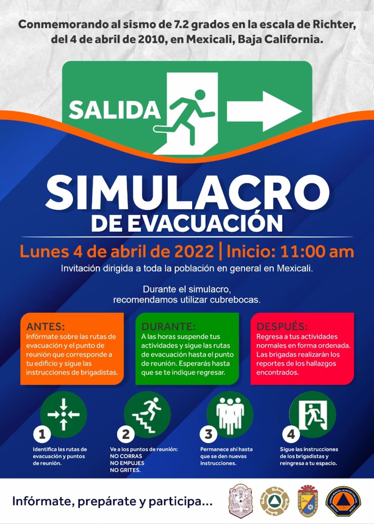 De acuerdo al documento emitido por Protección Civil donde invita a toda la comunidad mexicalense este 4 de Abril a un "Simulacro de Evacuación por Sismo".