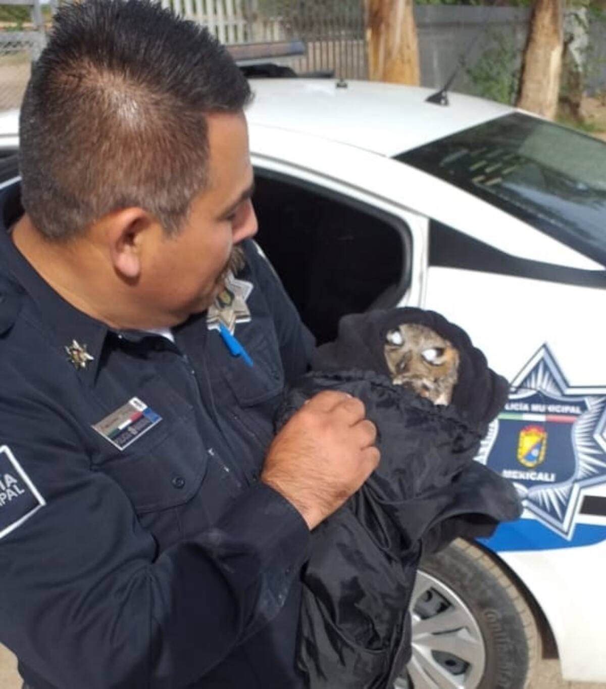 Un búho de ojos amarillos fue encontrado y rescatado por agentes municipales en un jardín de niños del valle de Mexicali este martes por la mañana.