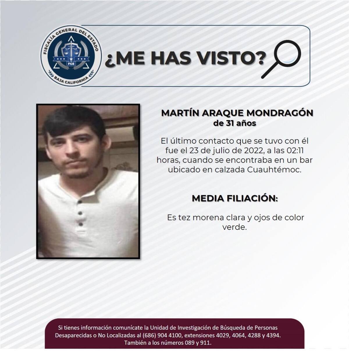 La Fiscalía General del Estado (FGE), a través de la Unidad Especializada para la investigación y Persecución de Delitos de Desaparición Forzada de Personas y Desaparición Cometida por Particulares, solicita la colaboración de los ciudadanos para localizar Martín Araque Mondragón de 31 años.