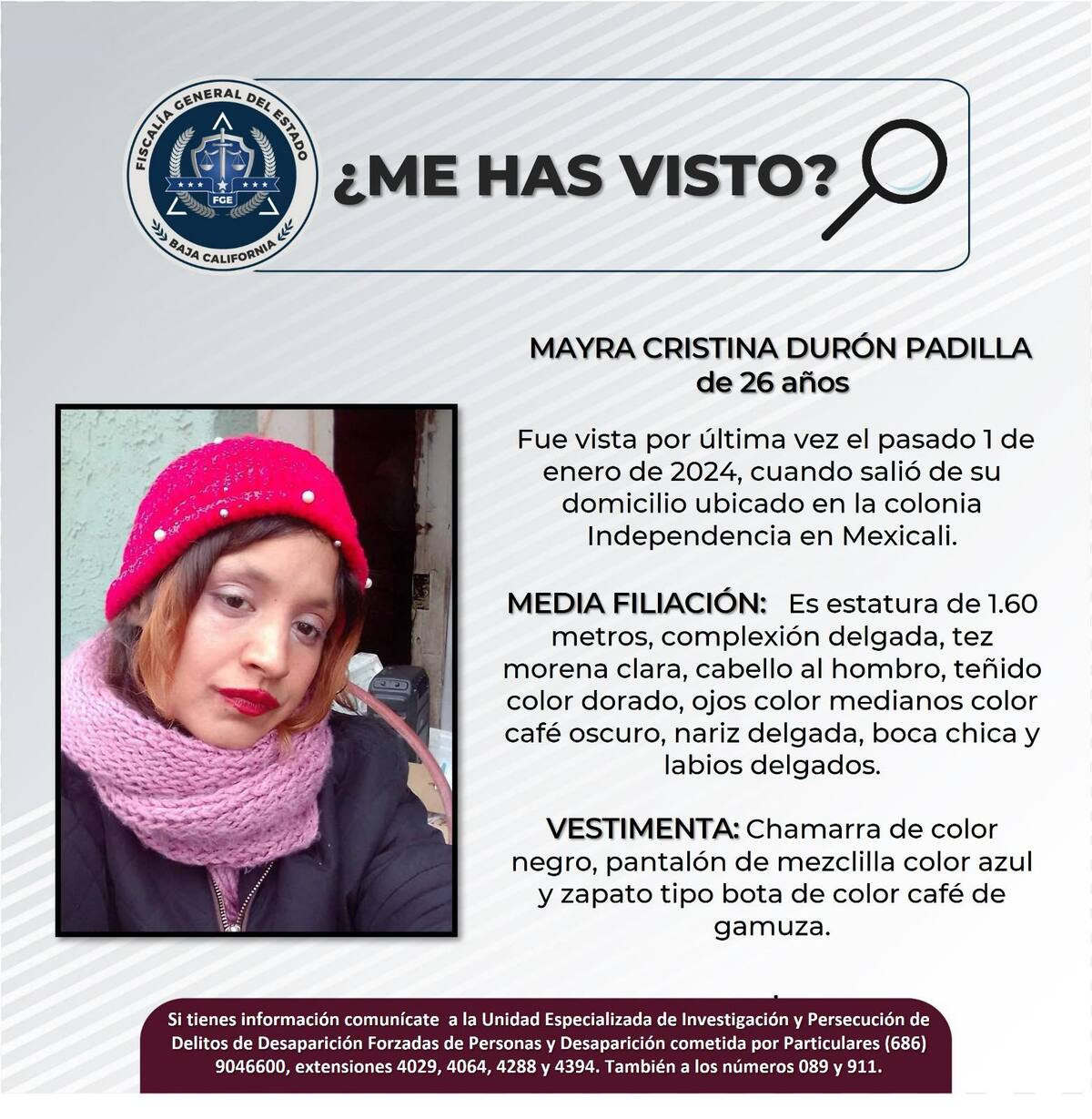 Mexicali, B.C.-La Fiscalía General del Estado (FGE), a través de la Unidad Especializada para la Investigación y Persecución de Delitos de Desaparición Forzada de Personas y Desaparición Cometida por Particulares, solicita la colaboración de los ciudadanos para localizar a Mayra Cristina Durón Padilla de 26 años.