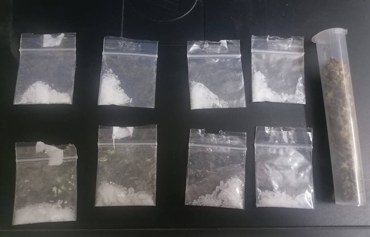 Durante la intervención se le encontraron ocho pequeñas bolsas que contenían una sustancia cristalina, con aparente metanfetamina, así como un recipiente con mariguana.