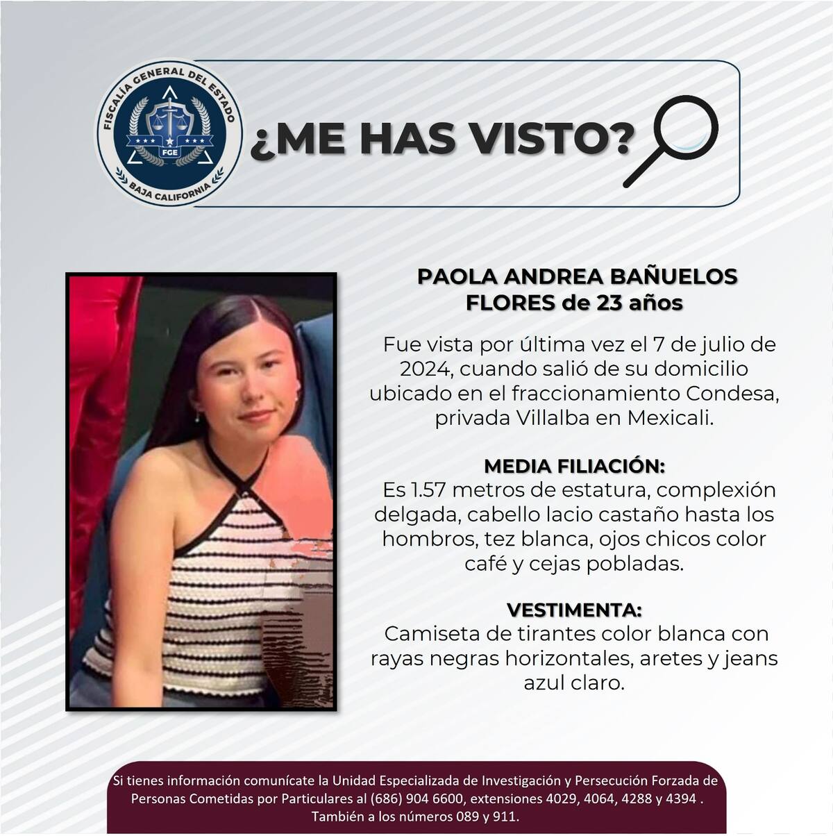 MEXICALI, BAJA CALIFORNIA, A 8 DE JULIO DE 2024.- La Fiscalía General del Estado (FGE), a través de la Unidad Especializada para la Investigación y Persecución de Delitos de Desaparición Forzada de Personas y Desaparición Cometida por Particulares, solicita la colaboración de los ciudadanos para localizar Paola Andrea Bañuelos Flores de 23 años.