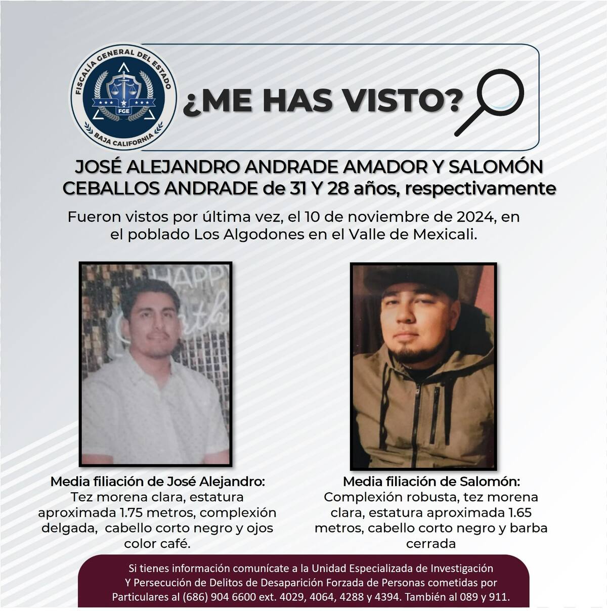 Mexicali, BC.- La Fiscalía General del Estado (FGE), a través de la Unidad Especializada para la Investigación y Persecución de Delitos de Desaparición Forzada de Personas y Desaparición Cometida por Particulares, solicita la colaboración de los ciudadanos para localizar a José Alejandro Andrade Amador y Salomón Ceballos Andrade de 31 y 28 años, respectivamente.