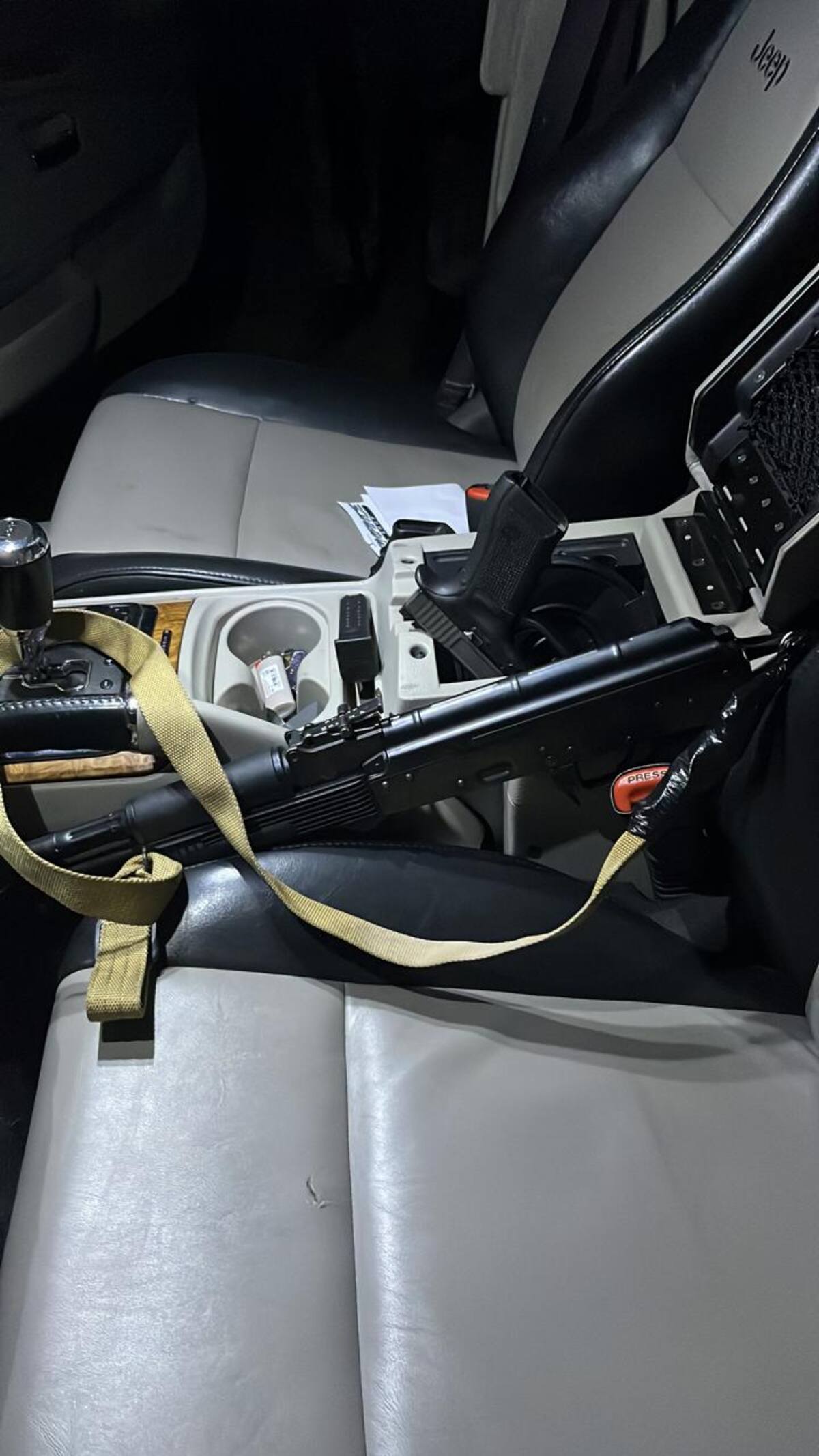 Al revisar la unidad, fueron encontradas tres armas abastecidas, dos de ellas escuadras Glock calibre 9 milímetros y un arma larga tipo subfusil, calibre 7.62 x 39, mismo que se encontraba abastecido con un cargador de 100 tiros.
