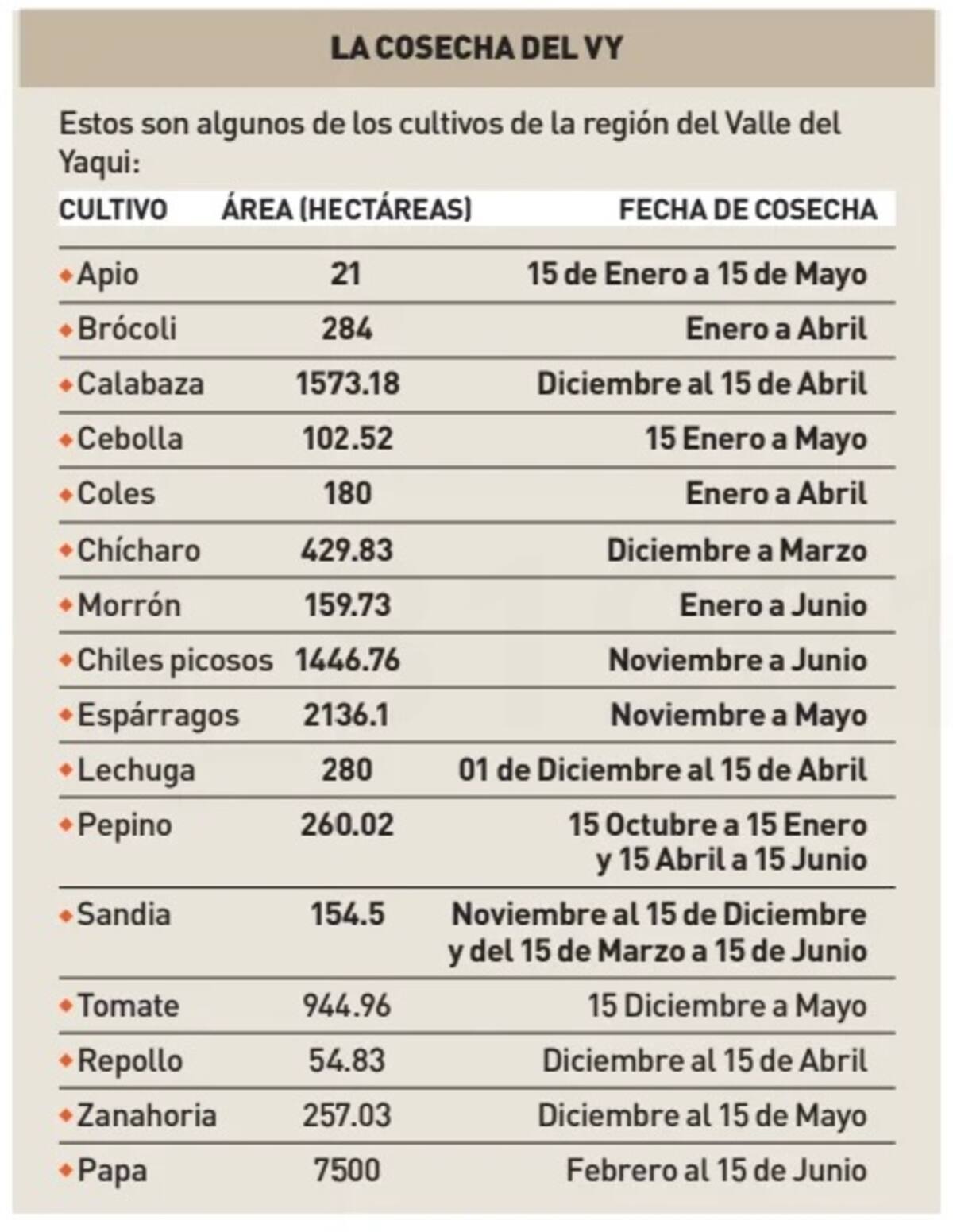En el Valle del Yaqui se siembran alrededor de 14 mil hectáreas de 25 diferentes tipos de hortalizas: Brócoli, calabaza, cebolla, coliflor, col de bruselas, chícharo, chiles picosos y chile morrón.